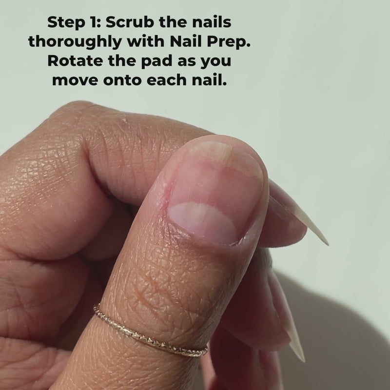 Remove oils and lotions by scrubbing each nail with a lint-free pad soaked in Nail Prep.