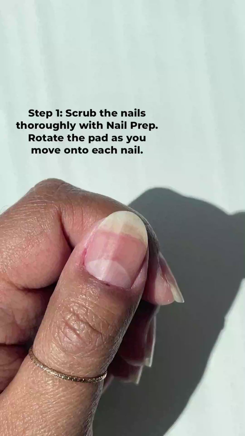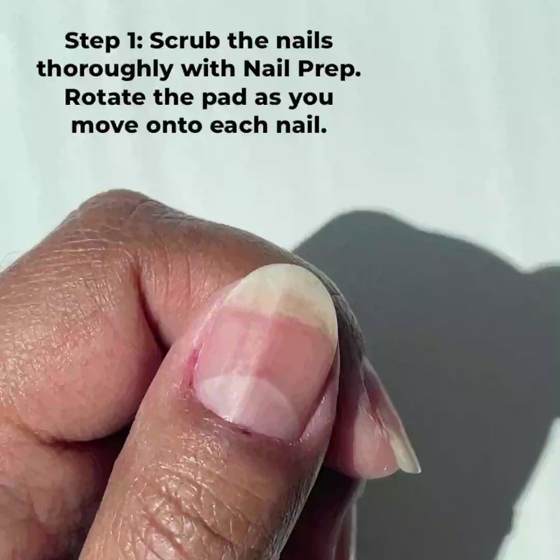 Step 1: Nail Prep Scrub each nail with a lint-free pad thoroughly to remove any oils or lotions.